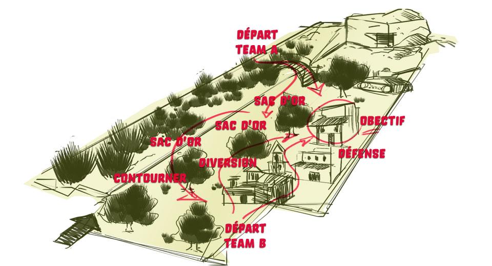 Un terrain WESTERN boisé d’une superficie de 2,3 hectares:Fort, prison, saloon, banque, char, tranchées, chariot,… agrémentent vos parties furtives ou techniques, le tout dans une zone forestière diversifiée.Un must pour le paintball scénarisé